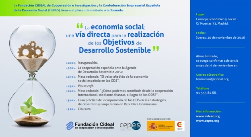 (Madrid, 21 de octubre de 2016).- La Fundación CIDEAL y la Confederación Empresarial Española de la Economía Social (CEPES) organizan el próximo 10 de Noviembre en la sede del Consejo Económico y Social de España en Madrid, la jornada “La economía social: una vía directa para la realización de los Objetivos de Desarrollo Sostenible”.